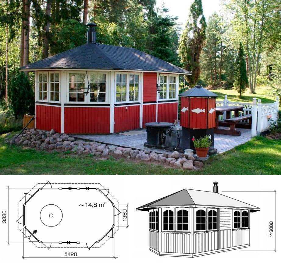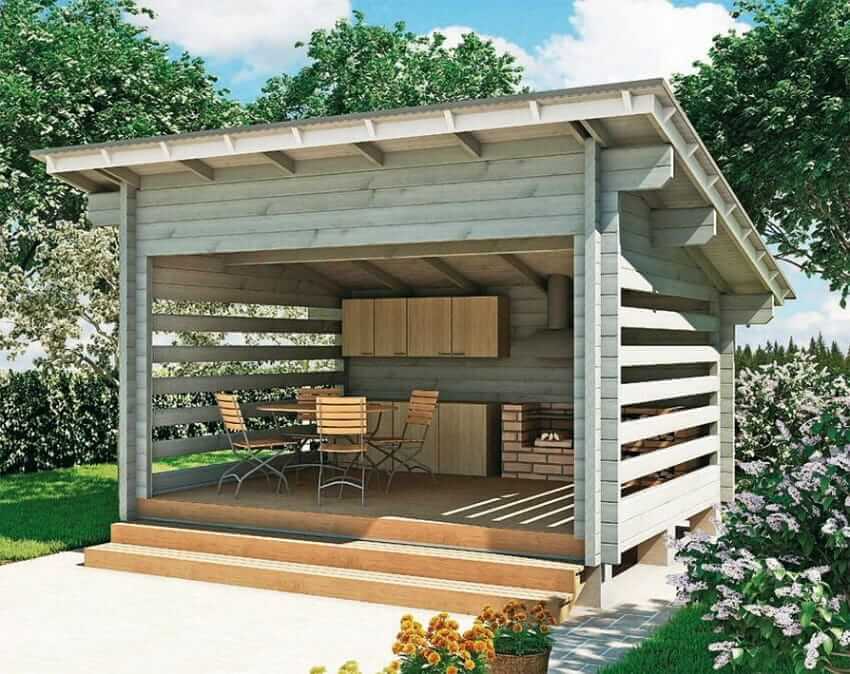 И уже проанализировав важные моменты, можно выбирать тип конструкции, варианты установки печи или барбекю, поводку труб и декорирование. Один из распространённых вариантов − летняя постройка открытого типа. Это аналог беседки, у неё остаются открытыми одна, две или три стены, обязательна установка крыши или навеса. К достоинствам строений открытого типа относят: