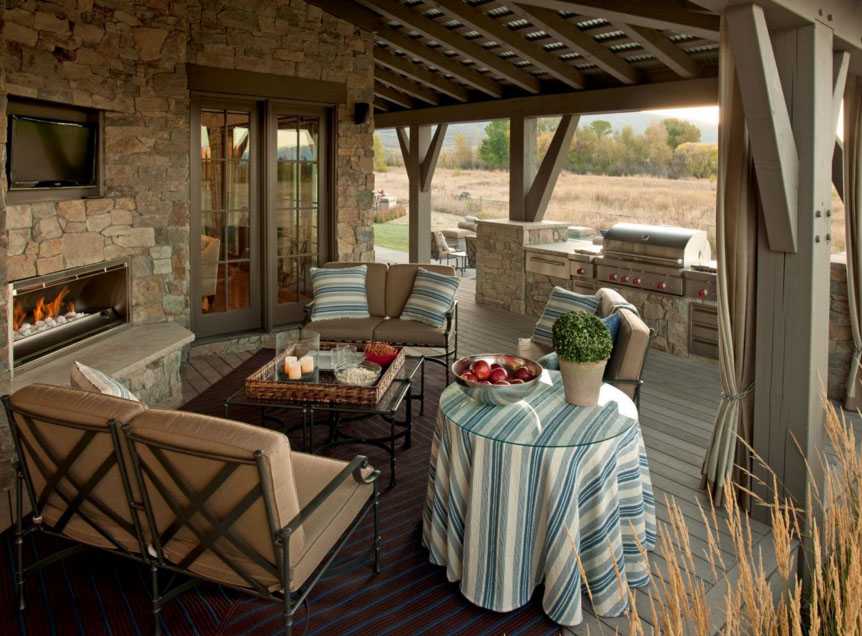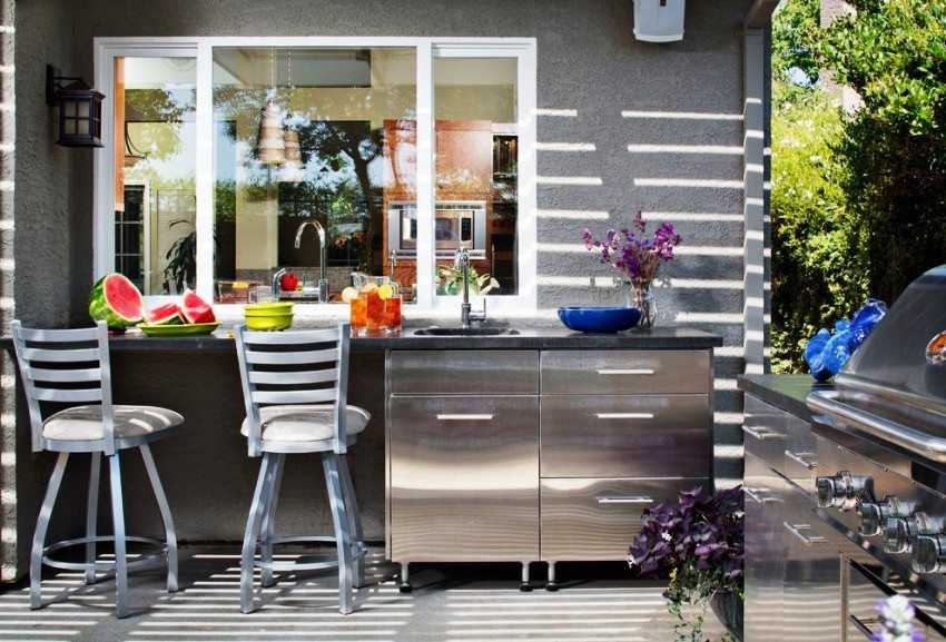 - на такой кухне обычно располагают барбекюшницу или мангал.