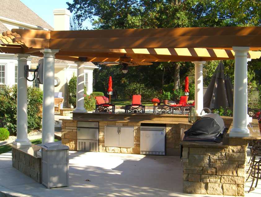Этот проект можно назвать самым функциональным и практичным. На территории такой кухни обычно устанавливают мангал, барбекю или камин. Здесь будет удобно проводить время с друзьями и близкими, проводить обработку собранного урожая и многое другое.