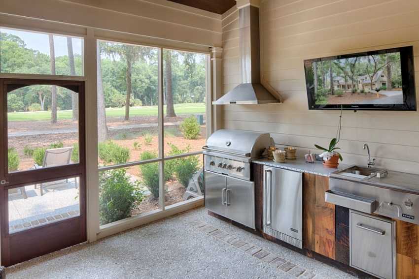 Очевидное преимущество закрытой летней кухни — независимость от погоды. Даже в дождь и ветер вы сможете комфортно приготовить пищу и съесть ее. К тому же, здесь размещают электрическую технику, не боясь что она выйдет из строя. Поэтому если вы хотите полноценную теплую летнюю кухню с холодильником, микроволновой печью, плитой, посудомоечной машиной, телевизором — данный тип строения для вас. Основной минус решения — высокая стоимость.