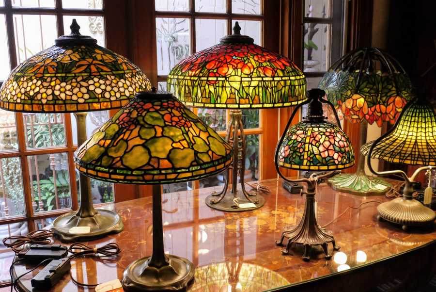 Луисом Тиффани были созданы шаблоны, своего рода витражные рисунки, по которым на производстве выпускали (и выпускают до сих пор) разнообразные модели дизайнерских светильников: ламп с абажурами, люстр. И за самыми известными, популярными, а также сделанными руками самого мастера охотятся коллекционеры всего мира. Знаменитые лампы «Маки», «Паутина», «Глицинии» уходят на аукционах уровня Sotheby’s за сотни тысяч долларов (а то и за миллионы).