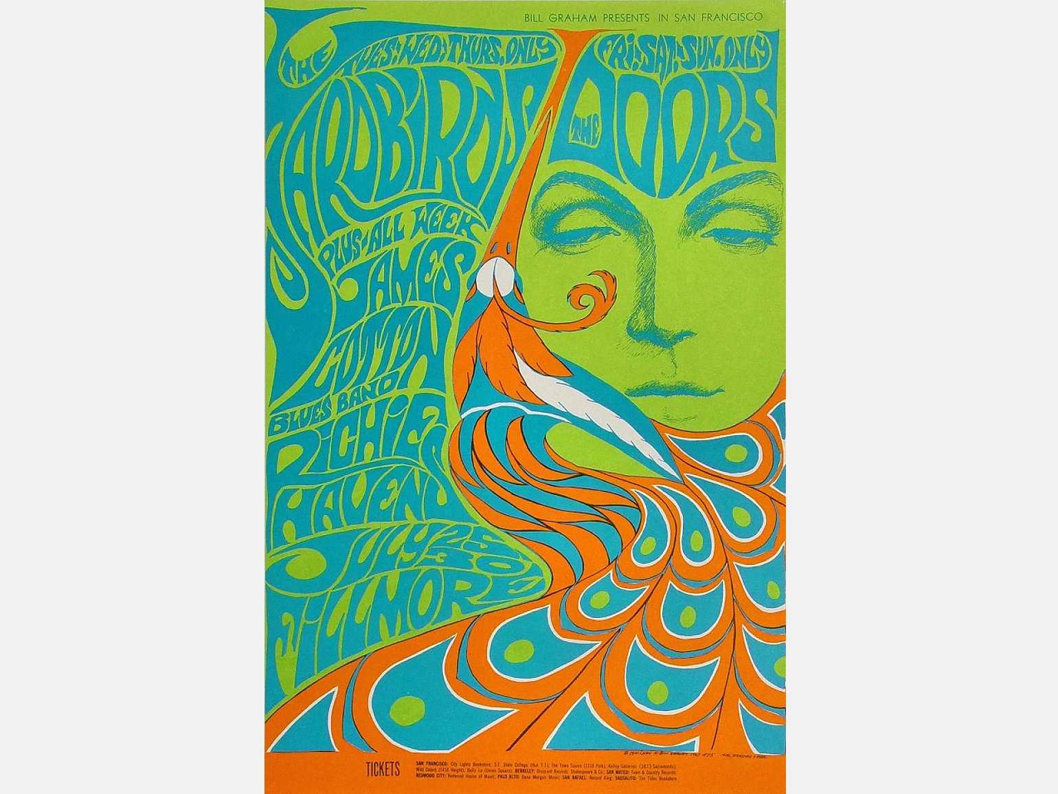 Музыканты, конкурируя за внимание слушателя, используют эксцентричные формы, шрифты, узоры, женские образы. Психоделическая культура хиппи переосмысляет модерн ― главное отличие нового «модерна» от образцов прошлого в использовании насыщенных, контрастных цветов и образов, соответствующих духу нового времени