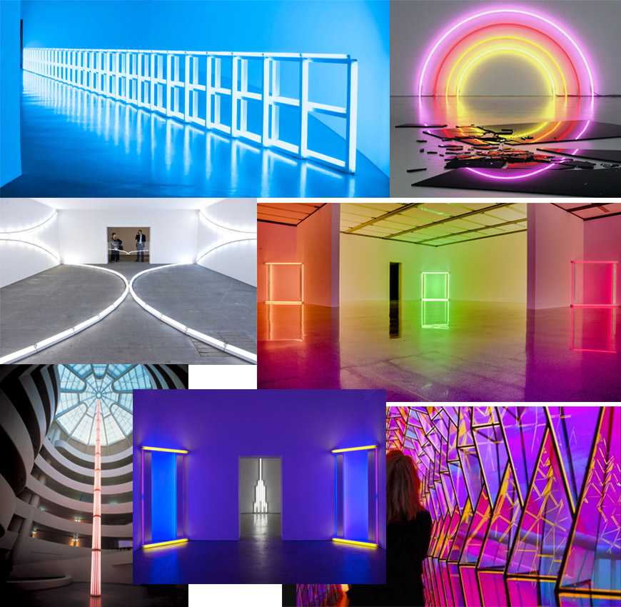 Благодаря Дану Флавину (Dan Flavin 1933–1996) световые картины увеличились до размеров световых пространств. В этих работах и некоторых других использовались светодиоды и световые панели, у Nill Bell (до 1928), также Jenny Holzer (до 1950) и других, искусственный свет вытеснил концептуальный формат картин на панно.