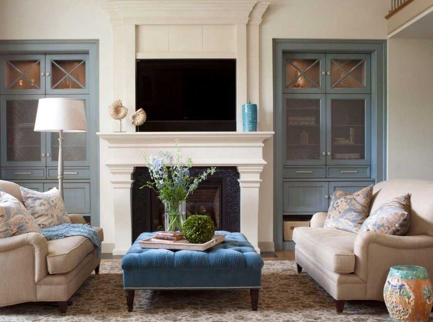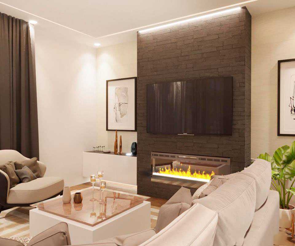 - из-за тесноты камином «жертвуют», его часть пространства отдают зоне с большим телевизором (напротив него также размещают гостевой диван с креслами, присоединяя к композиции компактный журнальный столик).