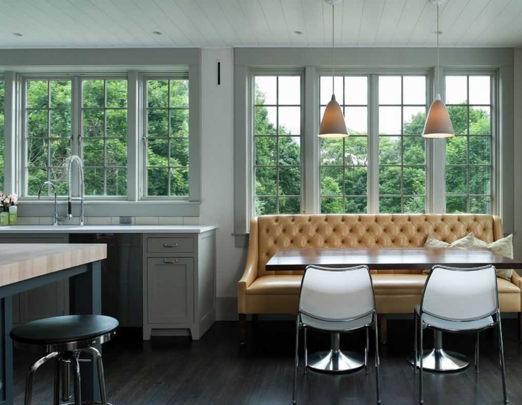 Если же вы делаете ставку не на функциональность, а на красивый дизайн, то традиционный угловой диван для кухни может заменить скамья, очень похожая на садовую лавочку. Она не имеет секции для хранения, но зато органично вписывается в интерьеры кухонь в классическом или деревенском стиле.