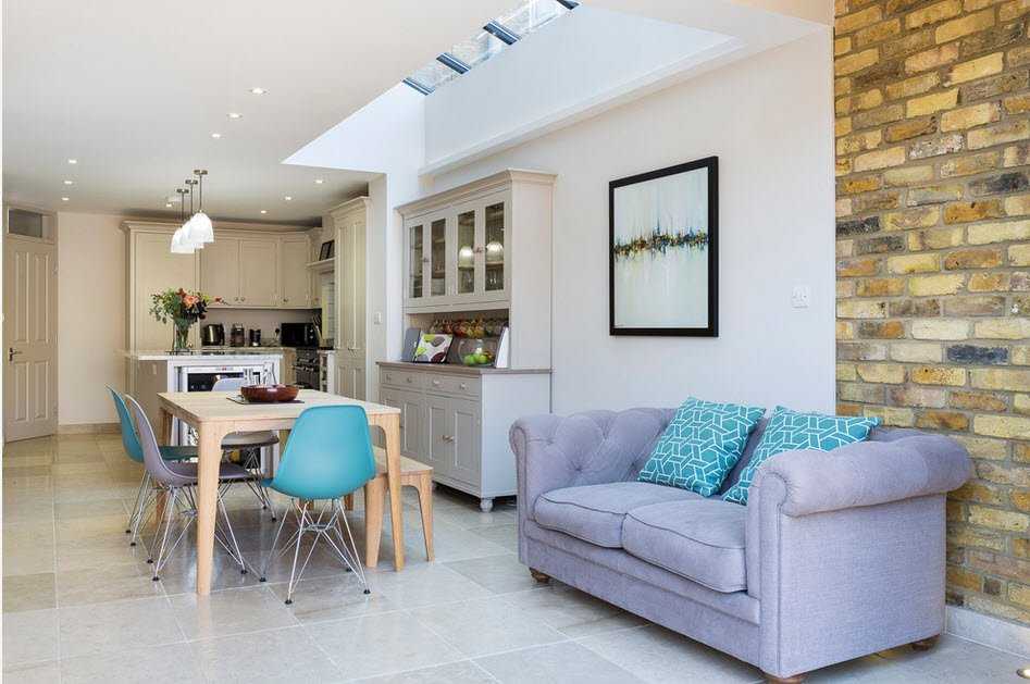 В объединённой кухне или в кухне в квартире-студии диваном можно разделить пространство на зоны – отдыха и столовой.
