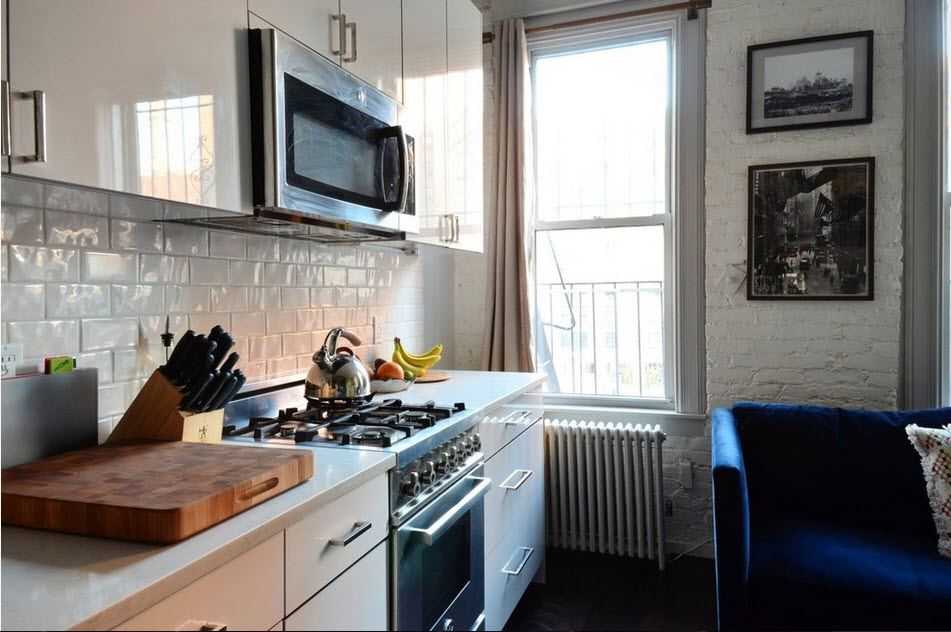 Узкий диван занимает совсем мало места, при этом вносит частичку уюта на кухню