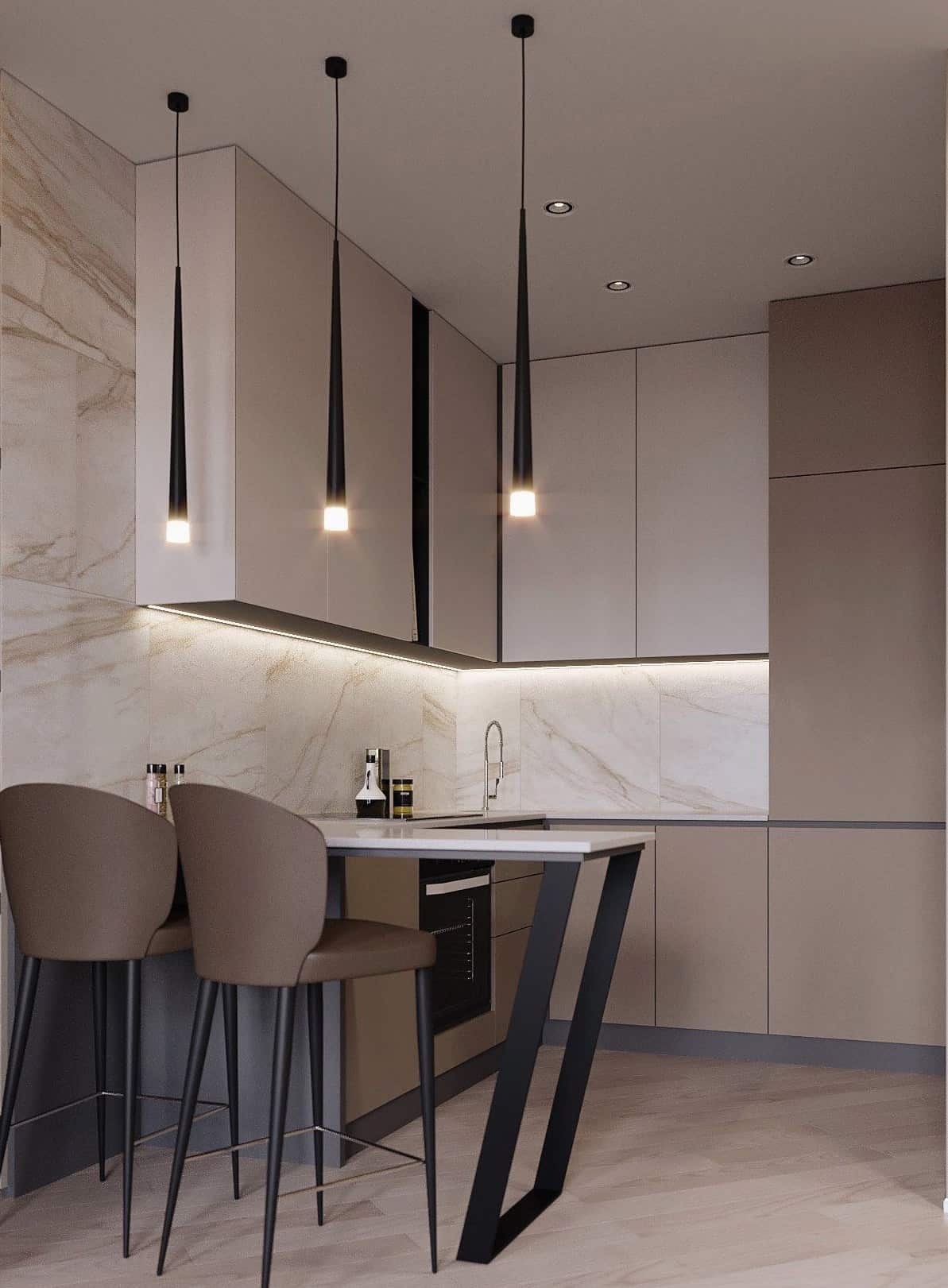 Подобный дизайн маленькой кухни 2022 обеспечивает комфорт хозяйке, делает помещение просторнее и смотрится актуально.