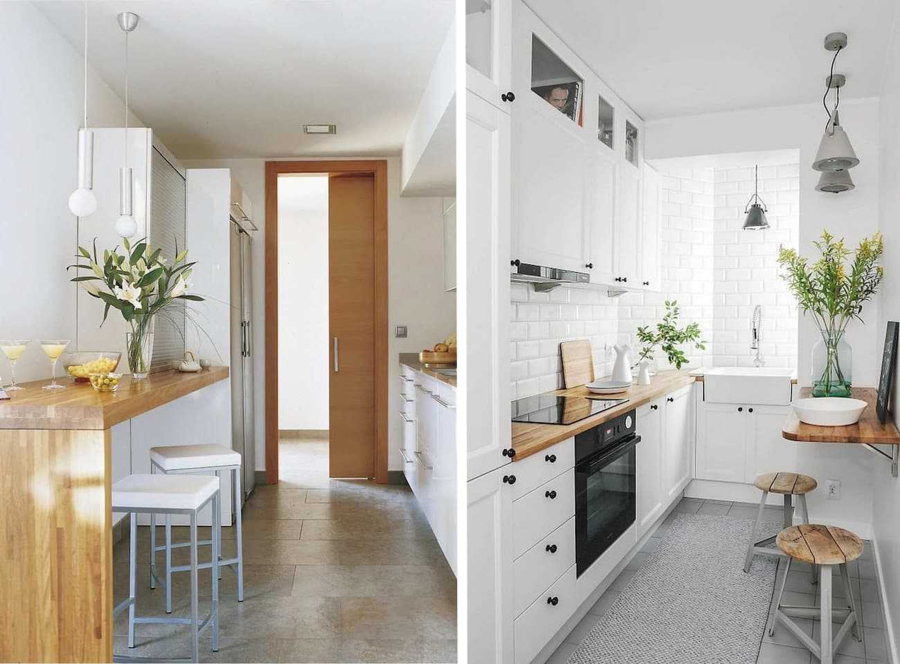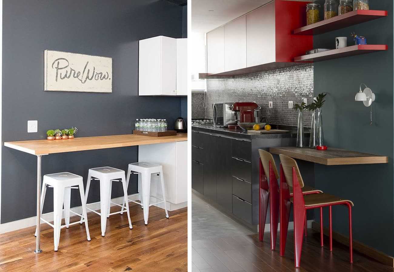 Установка барной стойки — оптимальный выбор для узкой кухни, где для обеденного стола не остается места. В такой ситуации небольшую барную стойку оборудуют у стены с окном, для удобства можно сделать ее откидной.