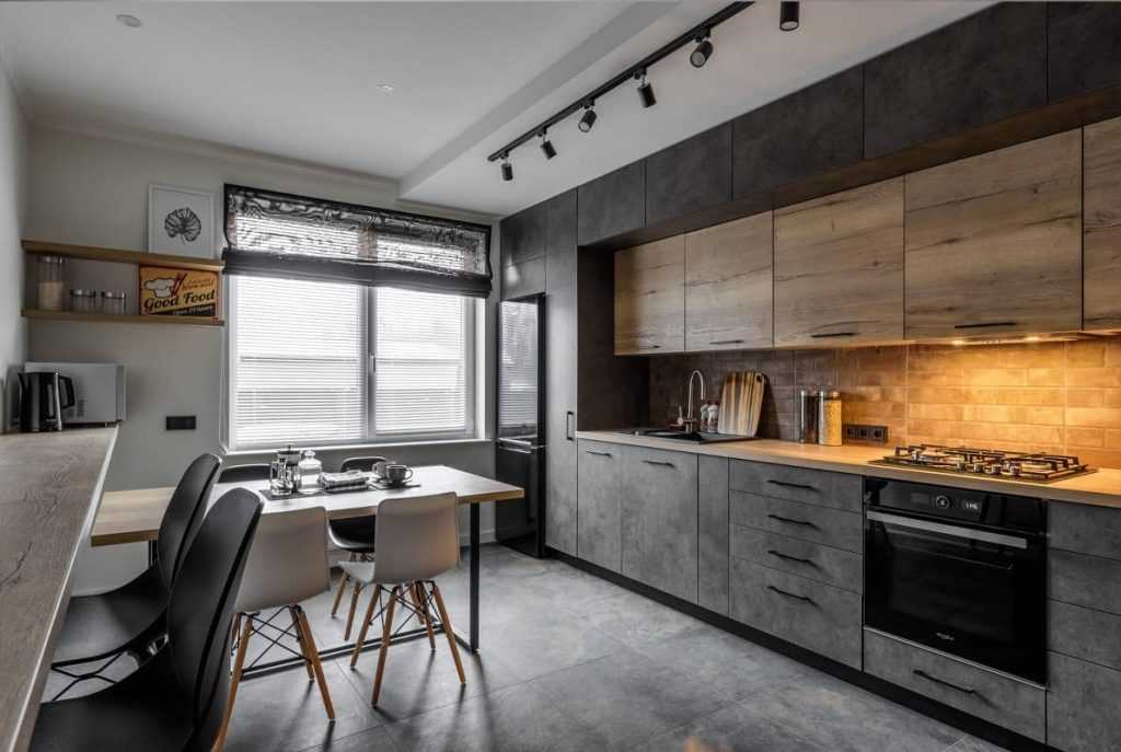 Смягчить темный цвет фасадов кухни помогут предметы мебели натуральных природных оттенков