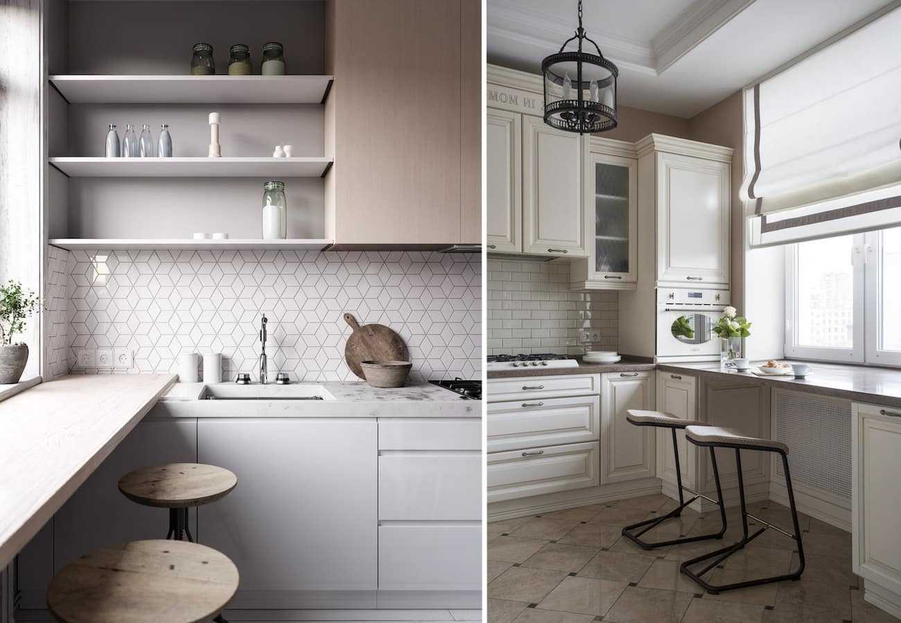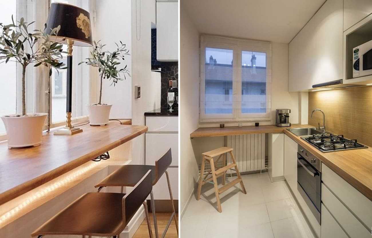 Все чаще роль барной стойки исполняет подоконник, который облицовывают прочным материалом и при необходимости делают более широким. Таким образом дизайн маленькой кухни 2021 становится более привлекательным и удобным.