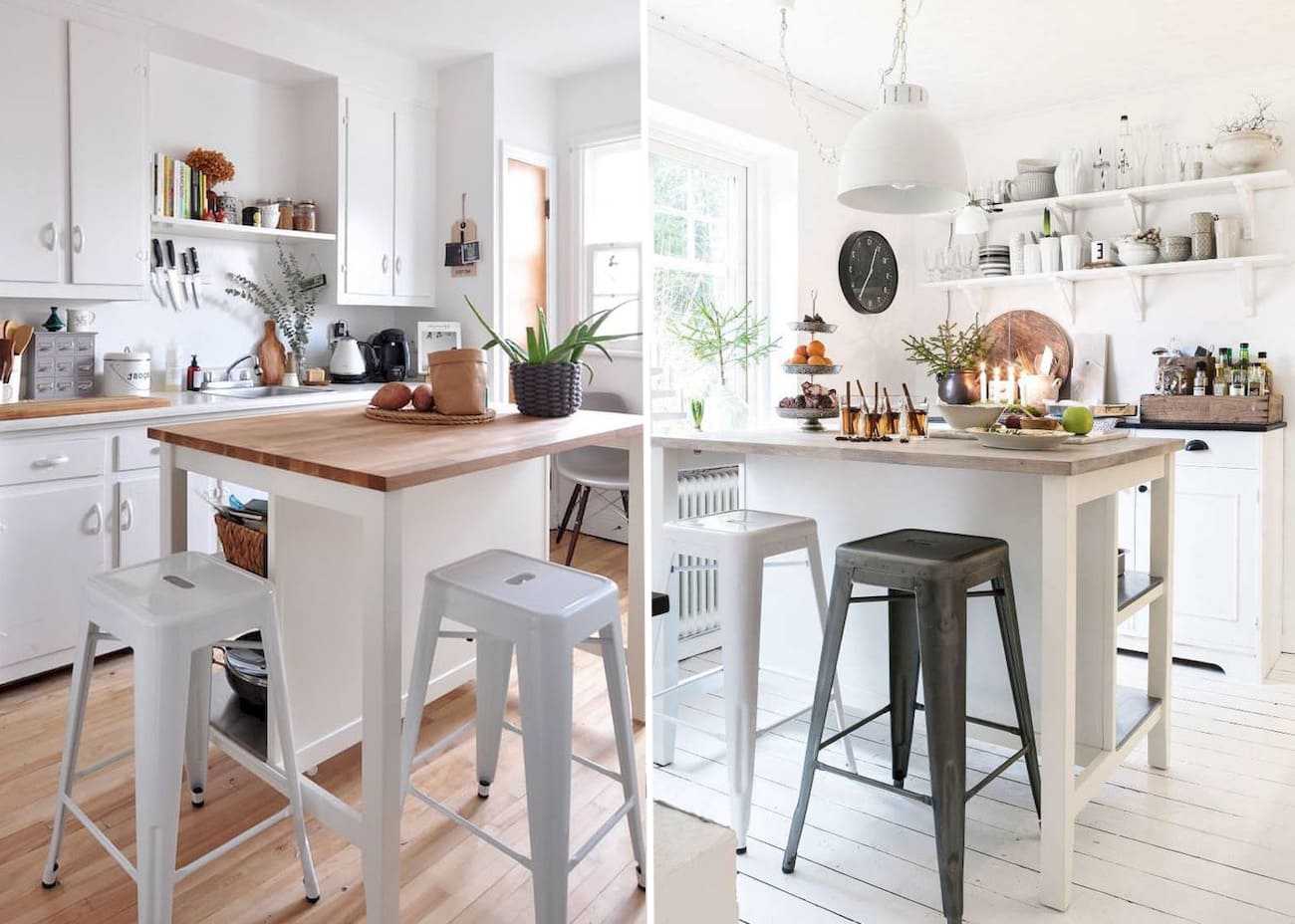 Устанавливают столик подходящей ширины, но не уже 30 см., стулья заменяют легкими удобными табуретами, которые задвигаются после использования под столешницу. Распашную дверь желательно заменить на раздвижную или складывающуюся гармошкой.