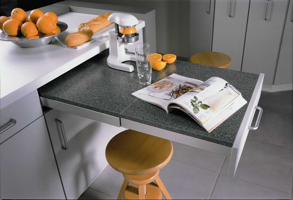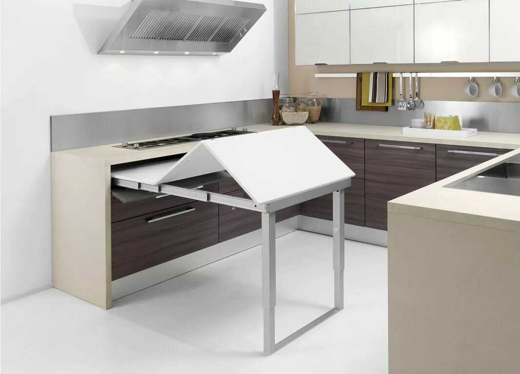 Если места на кухне не очень много, обратите внимание на столы-трансформеры, поверхность которых может значительно увеличиваться когда в этом есть необходимость