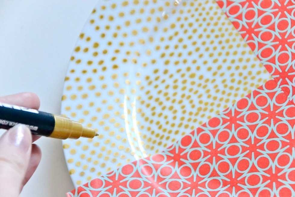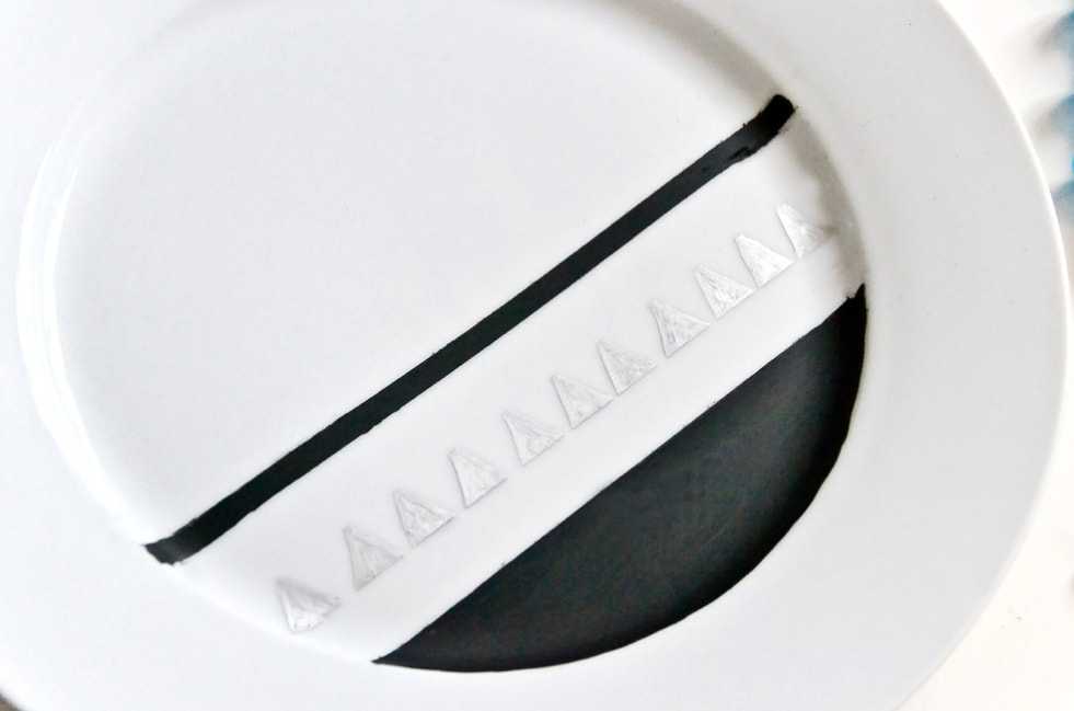 В данном случае используем более широкий скотч. Заклеиваем отрезком практически половину тарелки.