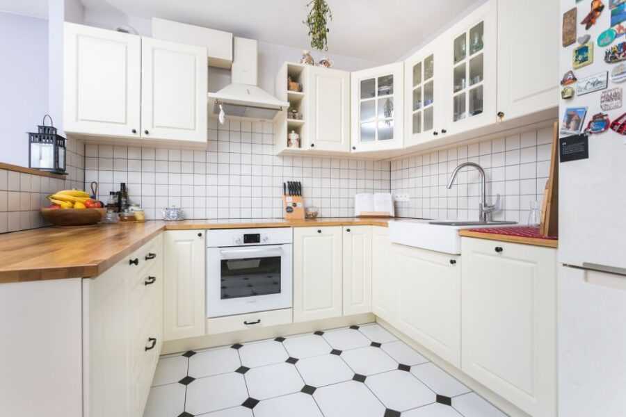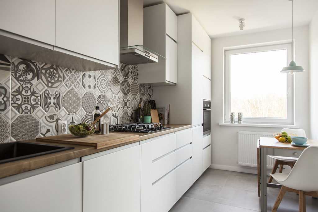 Желательно предпочесть глазированную плитку, поскольку пористая или рельефная создаст сложности с уборкой помещения. Сдержанная и опрятная светлая керамика будет одним из наилучших вариантов. Фартук из плитки «кабанчик» в белом цвете прекрасно вольется в интерьер как крупной, так миниатюрной кухни.