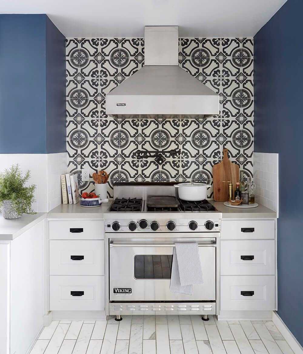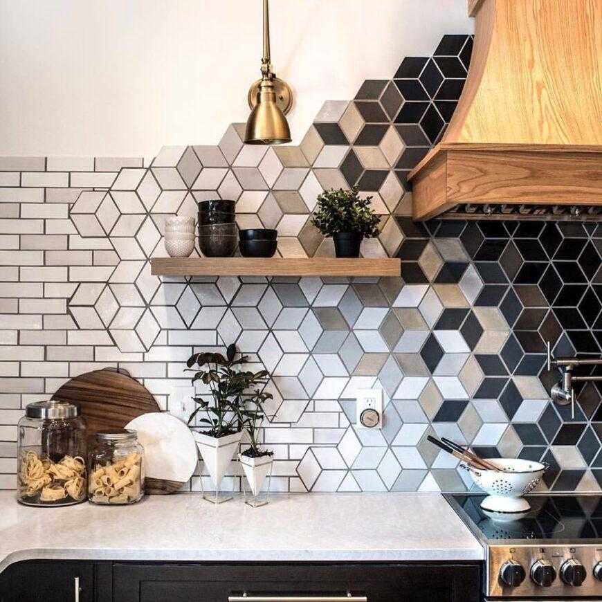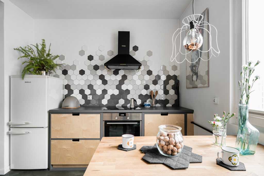 Керамическая плитка является традиционным и все еще популярным решением. Лишь несколько лет назад преобладала плитка формата 10×10 см, а в настоящее время в современных кухнях набирают популярность крупные форматы керамической плитки, полированного керамогранита, уложенного на тонкие швы, структурные плитки или шестиугольники.