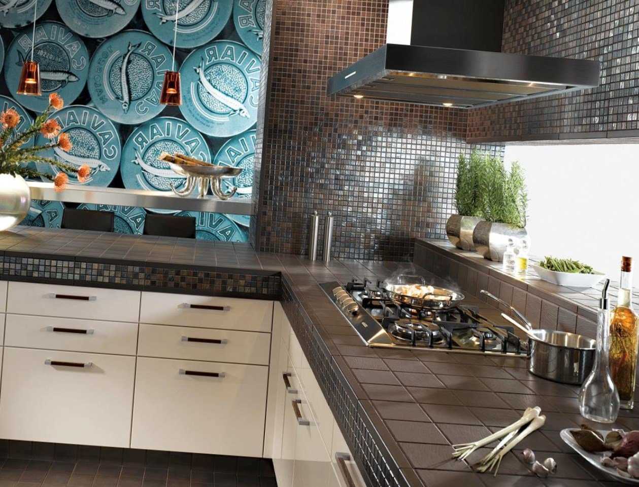 - Если на кухне очень много различных ярких рисунков или узоров, тогда цвет мозаики выбирайте более спокойный, лучше всего в такой интерьер впишется однотонная плитка;