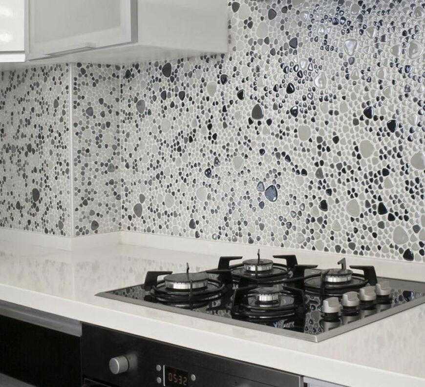 Благодаря бликам, которые разливаются по поверхности стеклянной плитки, ваша кухня всегда будет сверкать и переливаться. Такая плитка не требует особой уборки, но периодически стоит ее протирать специальными средствами по уходу за стеклом.