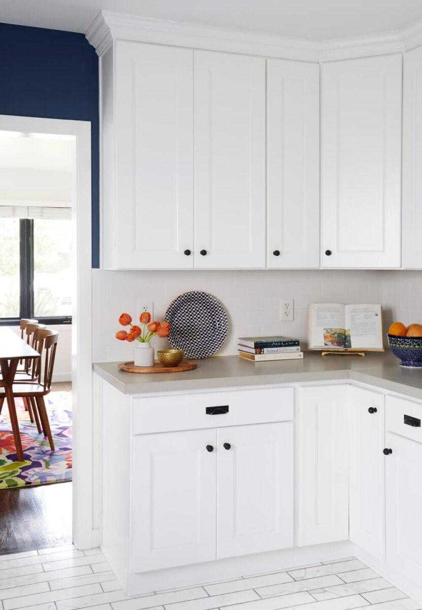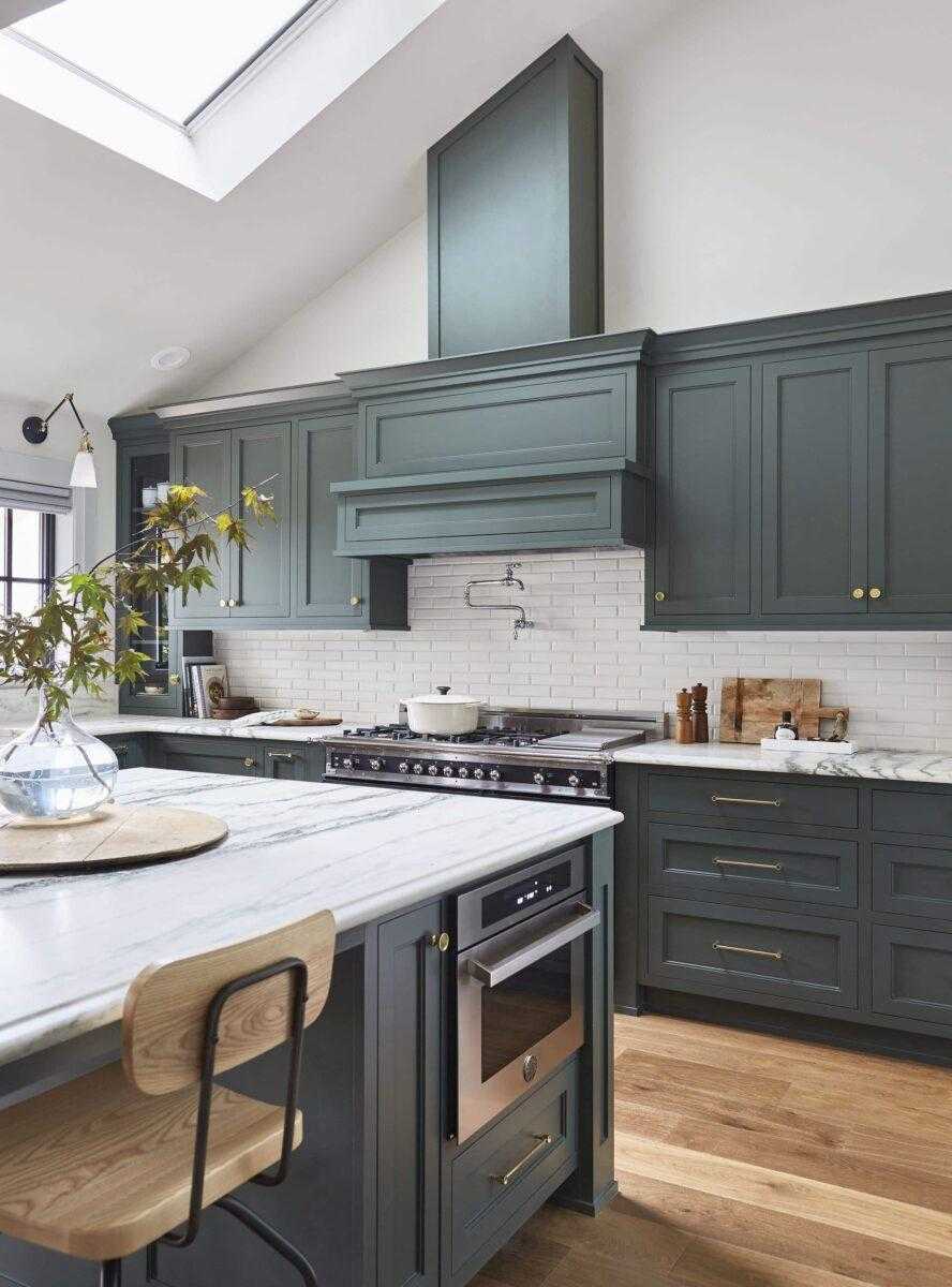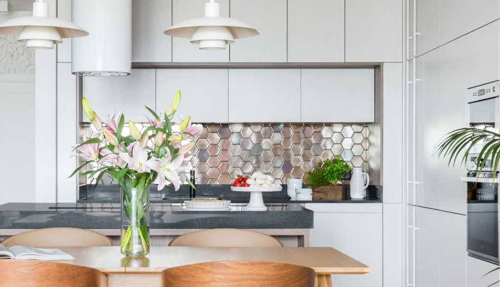 Этот прием идеально подойдет для кухни-гостиной, когда акцентировать внимание нужно на гостиной, а не на рабочем пространстве кухни. В этом случае отделать фартук лучше не плиткой, а, скажем, стеклянной панелью или покрасить стену в этой области специальной влагостойкой краской