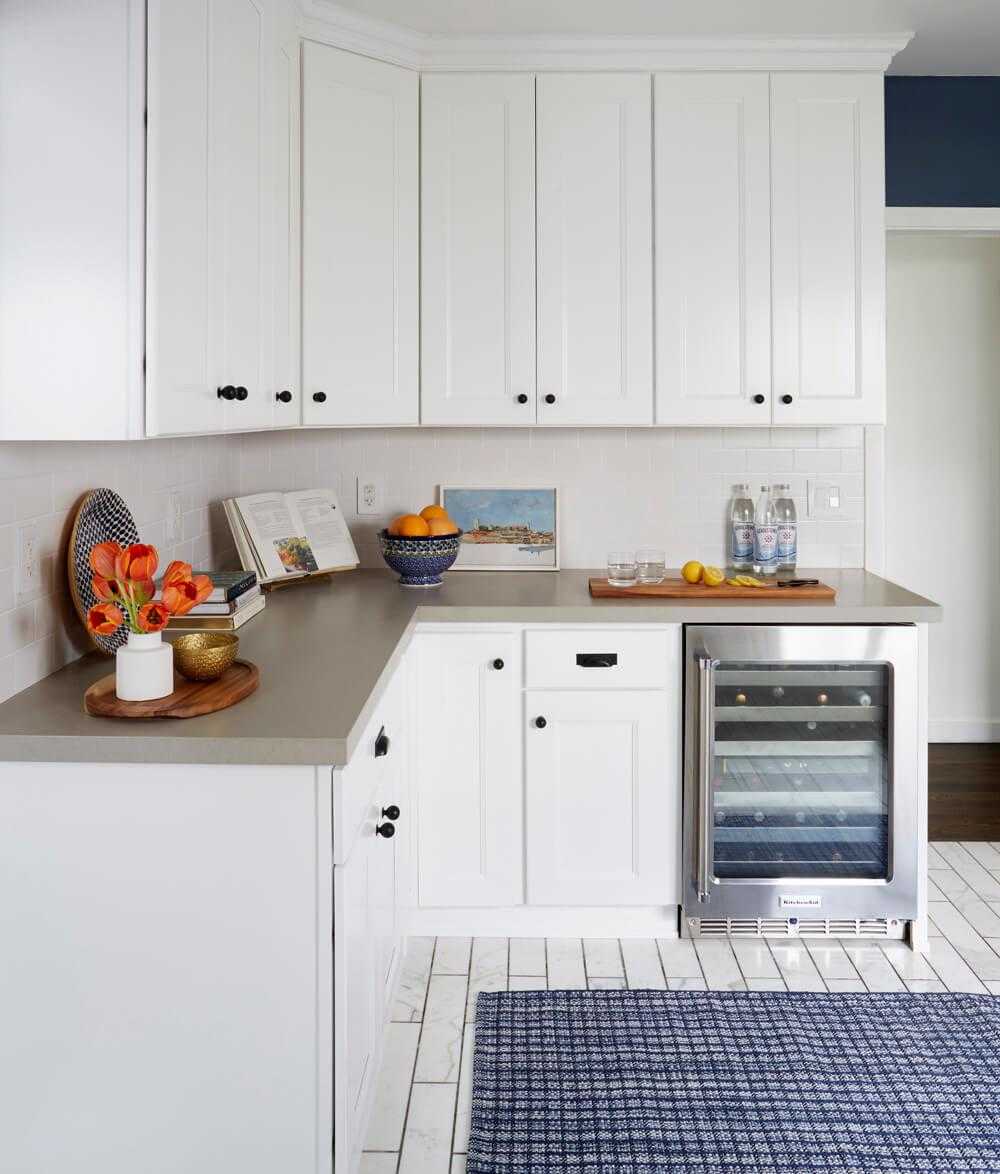 Это смелое решение поможет разнообразить пространство. Пользуемся контрастом: темное и светлое, матовое и глянцевое, с узором и без. Выполняем фасады в монохромном стиле и делаем сочный ярко-желтый элемент. Он выступит фокусной точкой в интерьере. Чтобы помещение смотрелось гармонично, добавляем пару акцентов в виде кружек, коврика или вазы в том же желтом цвете. Однако, не стоит перебарщивать с яркими цветами, иначе кухня будет смотреться дешево. Можно сделать проще и добавить матовый темно-серый фартук к жемчужным фасадам. При правильном подборе, такая кухня будет смотреться дорого.