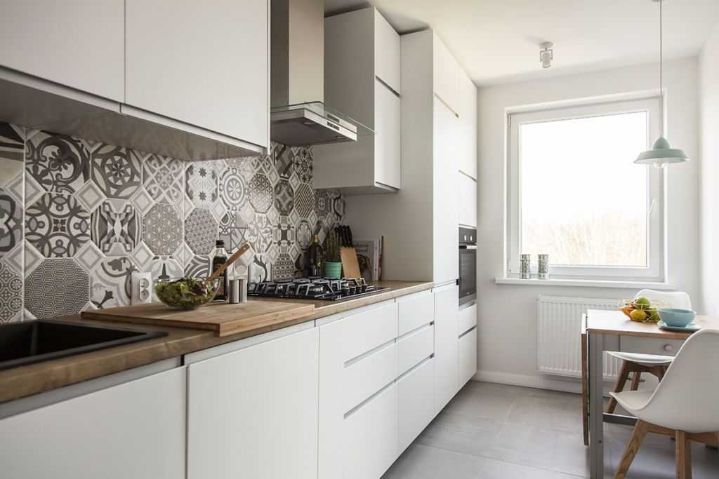 Если вы не согласны (зря) и всё же хотите сделать зону из плитки, то хотя бы делайте её нормального размера. Делать её маленькой — чудовищная ошибка. Зона загрязнения на кухне довольно большая. Если вы сделаете зону кафеля меньше 1.5 метров, то стык будет в зоне загрязнения. А значит под него постоянно будет забиваться грязь, будет попадать влага, его неудобно будет убирать. Т.е. вы сделаете только хуже. Минимум полтора метра плитки от шкафов.
