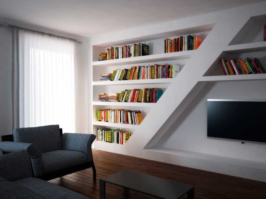 Угловые полки для книг и декора в гостиной Источник psk-remont.ru