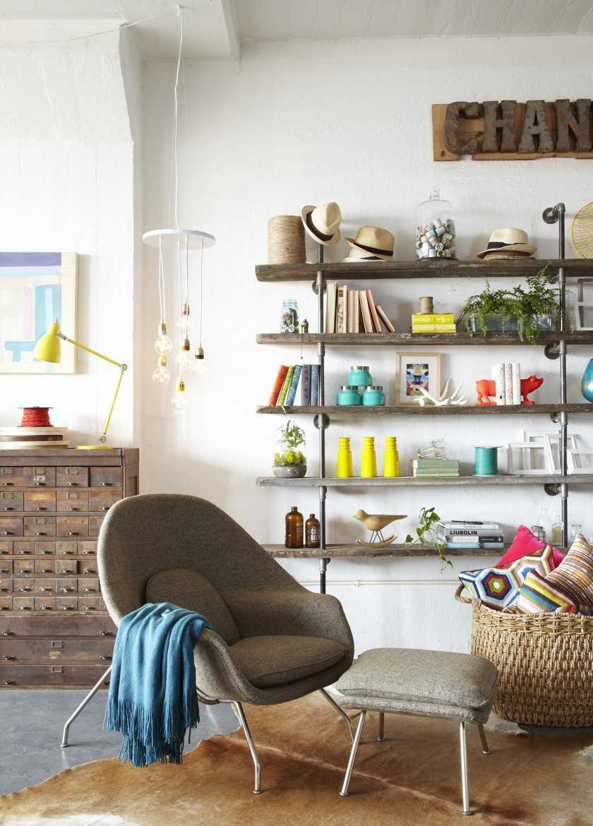 Настенные полки играют в интерьере комнаты важную роль. На фото представлены варианты расположения на них предметов. Каждому элементу декора присущ свой вес — визуальный и физический. Так, в нижней части традиционных книжных стеллажей обычно стоят тяжелые тома в толстых переплетах, на уровне глаз — книги в ярких обложках, вверху — облегченный изящный декор.