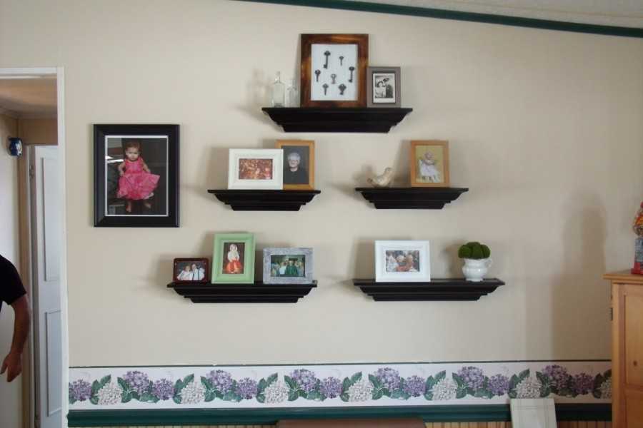Интересным решением для разных комнат станет навесная настенная полка. На фото можно увидеть возможные варианты оформления. На настенной модели очень удобно хранить все, что украшает комнату и подчеркивает ее оригинальность. При этом желательно соблюдать ключевые правила расположения на ней вещей. Например, расставление одинаковых предметов должно осуществляться таким образом, чтобы они составляли вершины треугольника. Размер данной композиционной фигуры может быть любым.