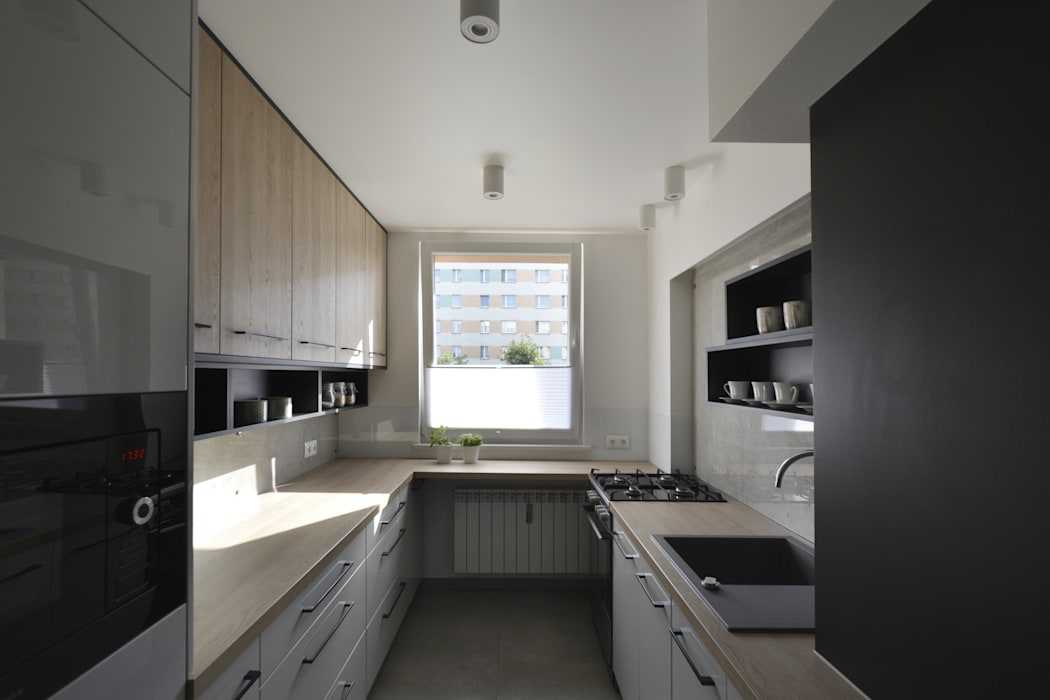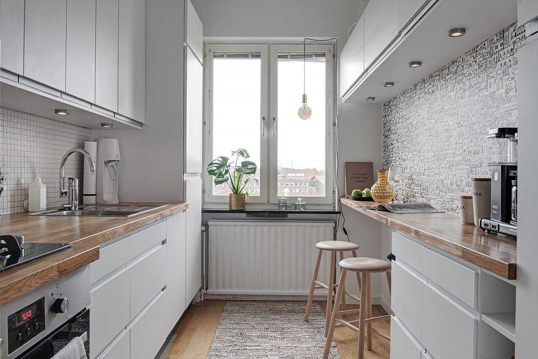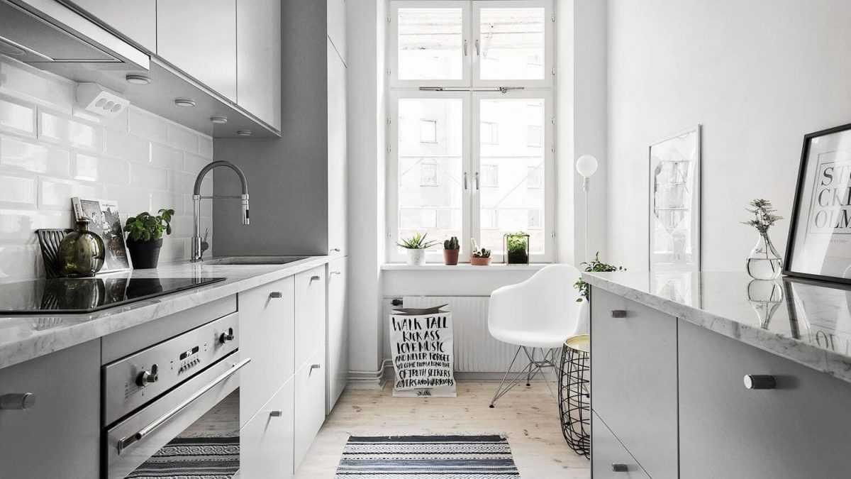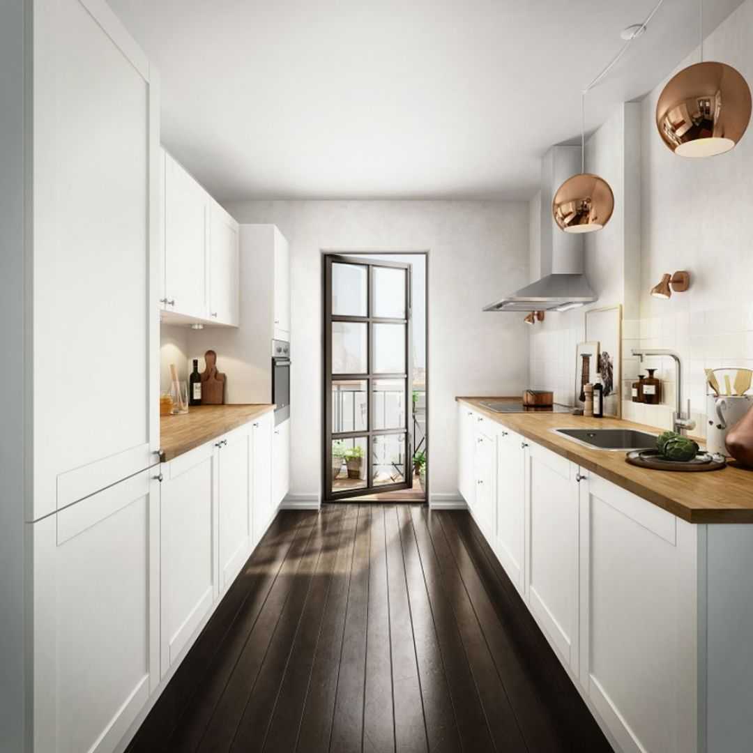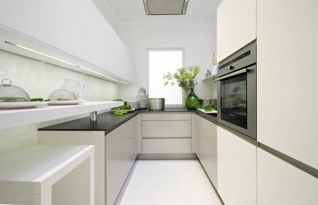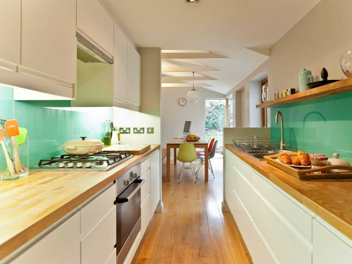 Дизайн узкой в конце имеет свои преимущества. Под ним можно обустроить обеденную зону, а гарнитур сдвинуть ближе к двери. К плюсам линейной планировки относятся: