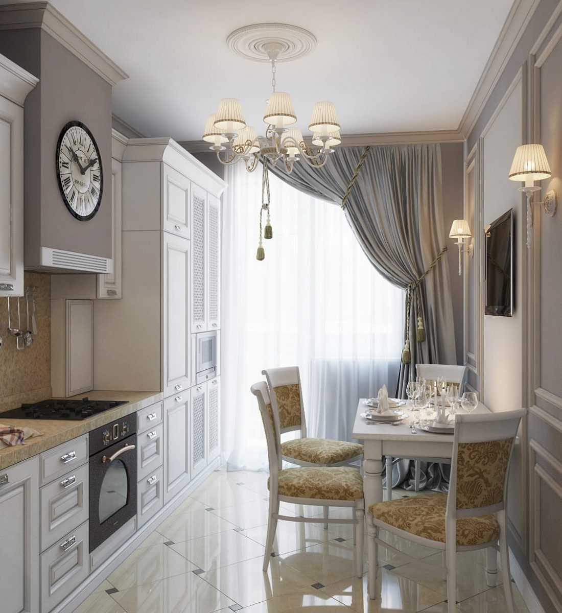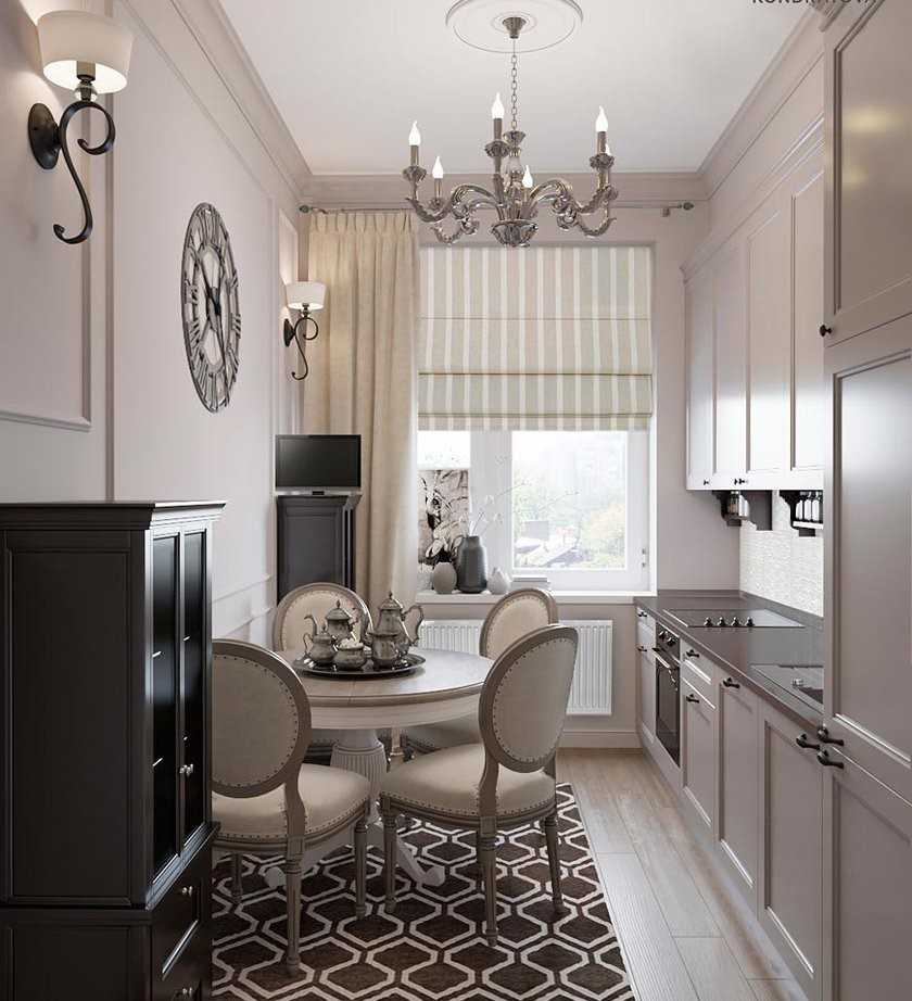 Существует целое направление под названием «Дизайн-хаки», с помощью которого можно оформить длинную кухню в стиле неоклассика. К основным чертам относятся: