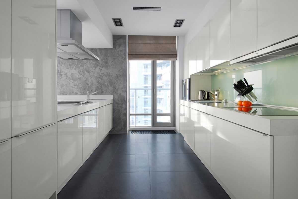 Этот вариант подойдёт для узкой и длинной кухни, в конце которой имеется окно или выход на балкон. Гарнитур, шкафы с бытовой техникой устанавливаются по двум сторонам вдоль стен параллельно друг другу.