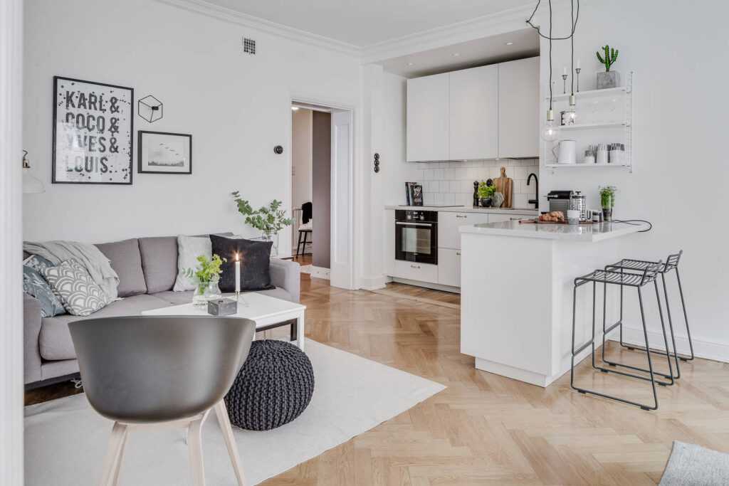 Белая гостиная с мини-кухней — хорошее начало для создания интерьера в скандинавском стиле. Композицию дополнят светлые стены и элементы под дерево на полу и мебели. Вы можете удачно дополнить такое расположение, например, горшечными растениями, создав между зонами специальную перегородку.
