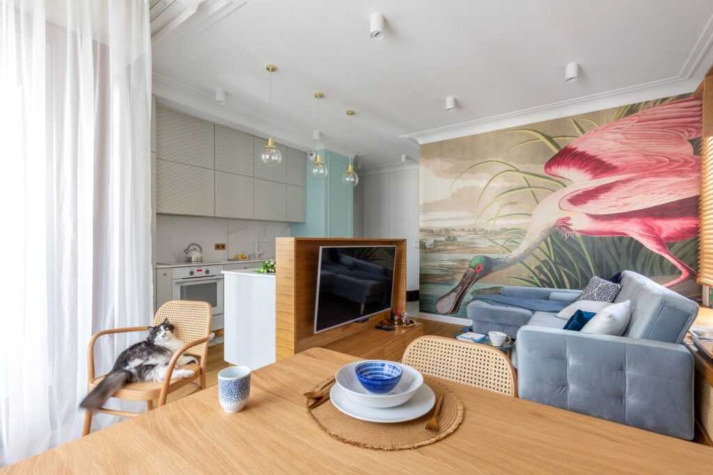 - Обои из натуральных материалов и фотообои применяют для зонирования.