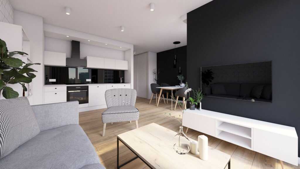 Современную гостиную с кухней в многоквартирном доме из-за ограниченного пространства можно сохранить в более светлых тонах. Здесь идеально подойдут нежные серый и белый, а характер интерьера подчеркнут только сильные аксессуары, такие как: черная фурнитура, красочные шторы или текстильные украшения.