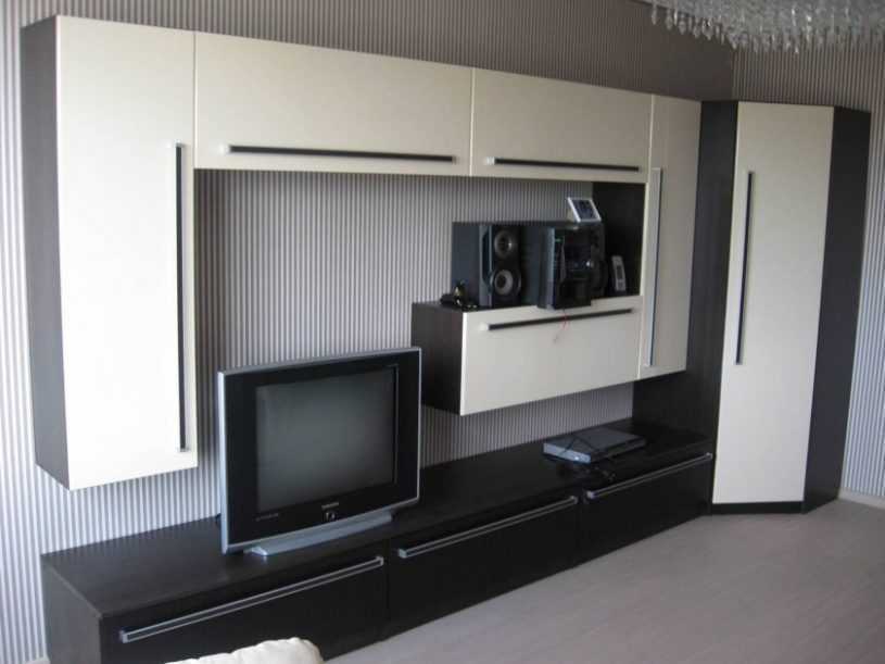 Для комнат небольшого размера лучше подобрать модули для угла: шкафы, комоды, стеллажи или тумбы под TV. В сочетании с ними хорошо будут смотреться подвесные полки, комоды и горки.