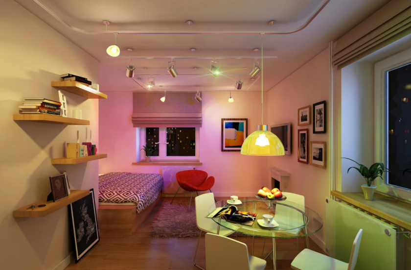 В квартирах с небольшой площадью следует избегать нижнего уровня света. Подобный дизайн маленькой студии будет актуален, если нужно визуально разграничить комнату. Выбирайте оригинальные светильники, которые будут сочетаться с общей дизайном квартиры.