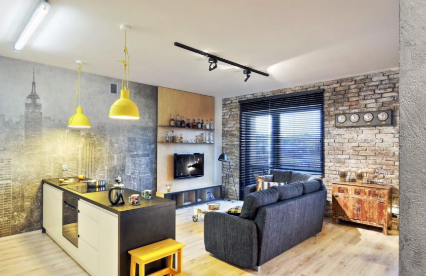 Интересные детали: сочетание горчичного и серого в квартире-студии