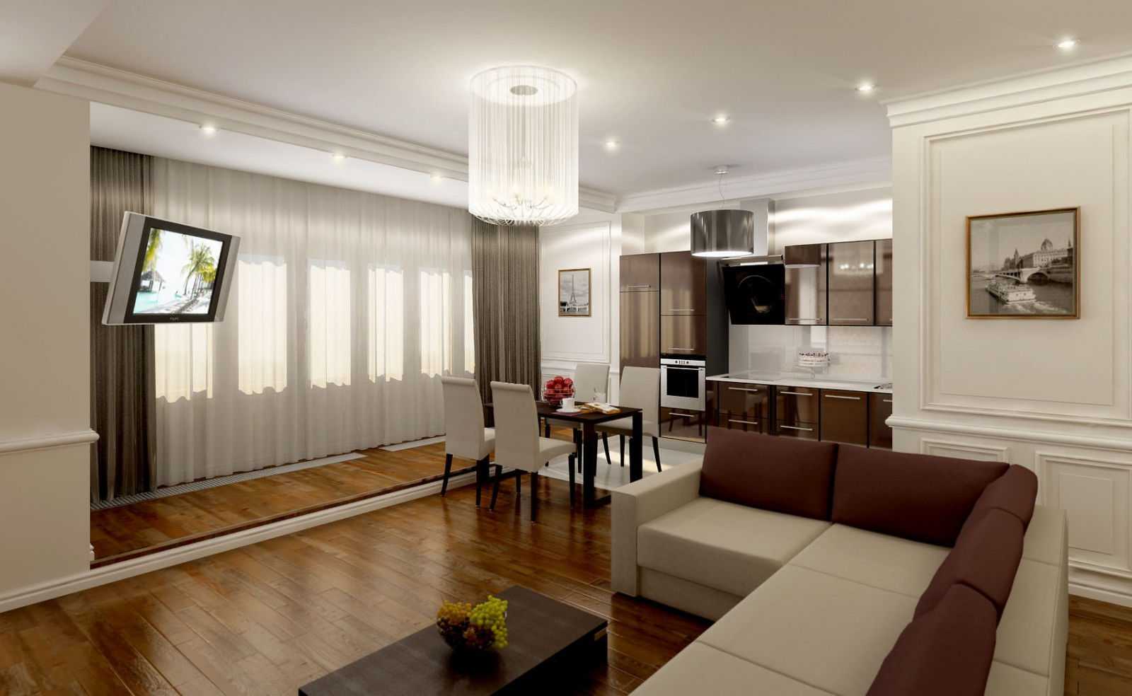 При желании можно добавить часть пространства коридора к гостиной и, таким образом, увеличить ее площадь. Мебель для основной комнаты рекомендуется выбирать компактную и функциональную. При ее покупке также учитывается количество человек, проживающих в квартире, а также их потребности.