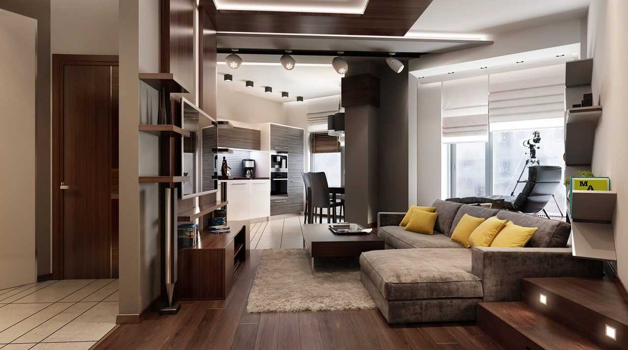 Начнем с выделения зон гостиной и кухни. Чаще всего зонирование выполняется с помощью дизайна потолка, пола. Это может быть отличие покрытия и цвета зон, разные уровни потолка, пола.