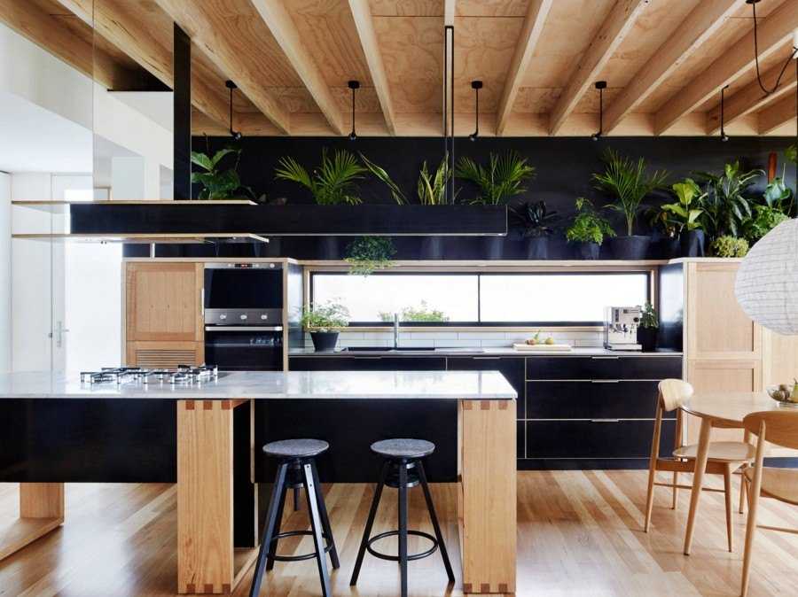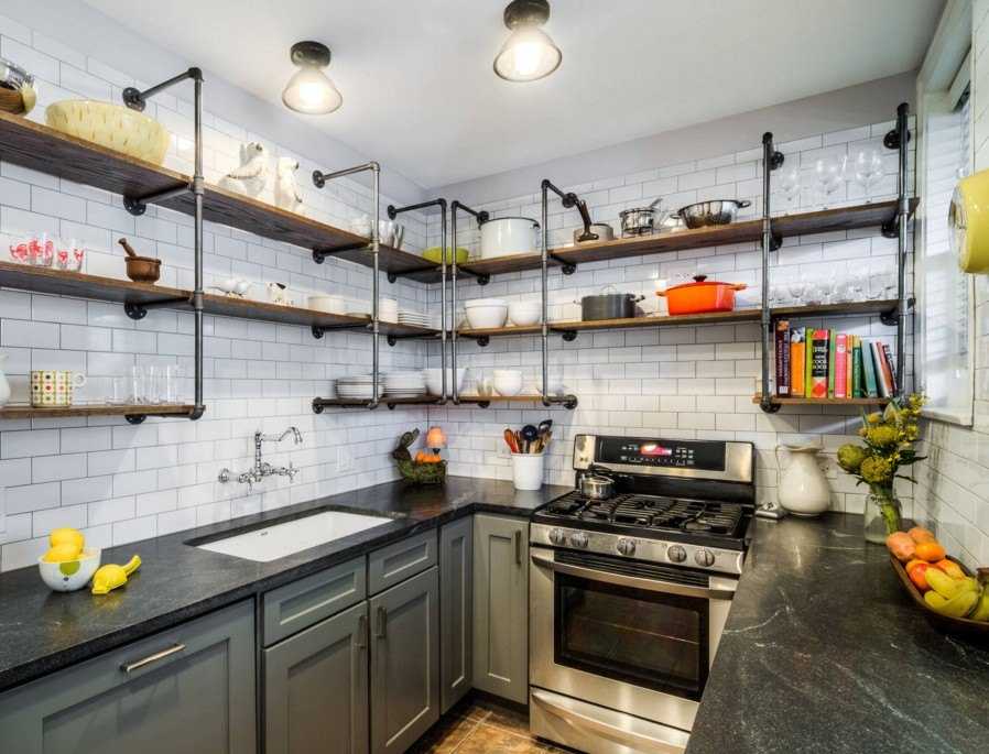 Металл отлично сочетается с деревом. Таким образом, вы можете разместить столешницы из массива дерева, которые добавят тепла кухне, а также на металлические украшения или полки.