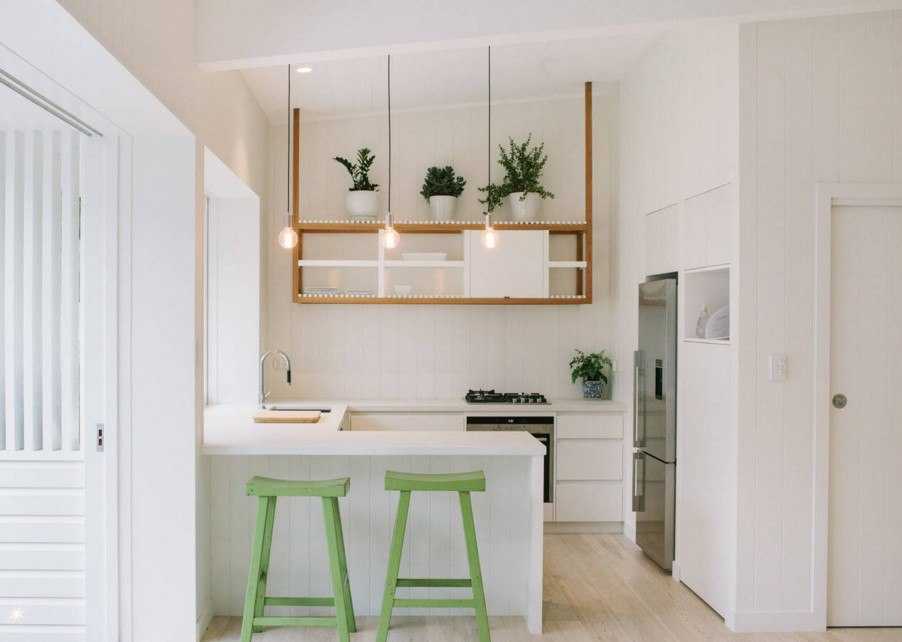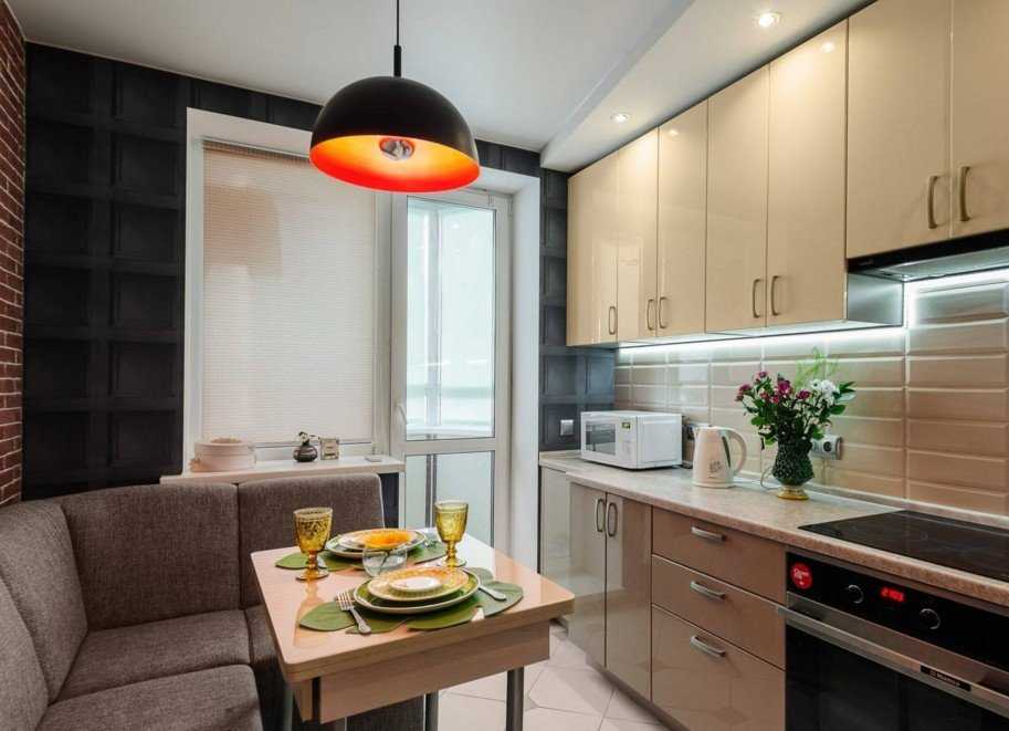 Следует избегать темных оттенков, которые могут зрительно уменьшить пространство. Стоит использовать бежевый, песочный, белый, персиковый, светло-оливковый цвета.4. Использование осветительных приборов. Маленькие креативные кухни можно центрально осветить настенными светильниками или небольшой люстрой. Дополнительное освещение создается с помощью точечных светильников или светодиодных лент.