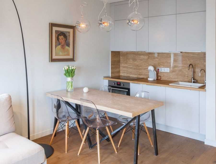 Выделяют следующие типы планировки с обеденным столом в тесном кухонном пространстве: