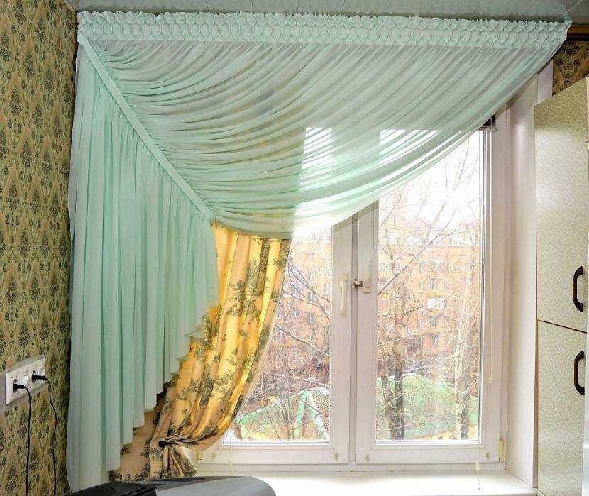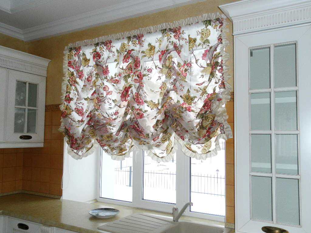 Короткие шторки могут быть выполнены в английском стиле (собираются в горизонтальные складки и фиксируются шнуром на необходимой высоте), более вычурные французские и австрийские шторы (текстиль драпируется). Как правило, такие сложные шторы — прерогатива просторных кухонь.