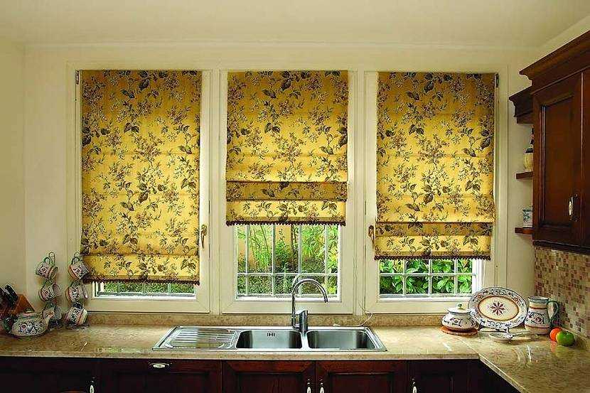 Этот вариант занавесок удобен в использовании, он не усложняет дизайн кухни, не утяжеляет ее. При необходимости римские шторы можно убрать, сохранив естественное освещение на кухне.