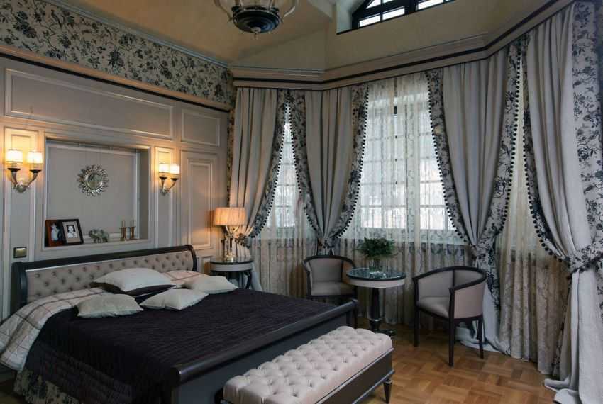 Вместо тюля обрати внимание на шелк или органзу, а поверх – бархат, велюр, объемные гобеленовые ткани. Но учти, что это уместно только в большой и просторной спальне. Пышные шторы с ламбрекенами, кистями и подхватами хорошо сочетаются с таким же балдахином над кроватью