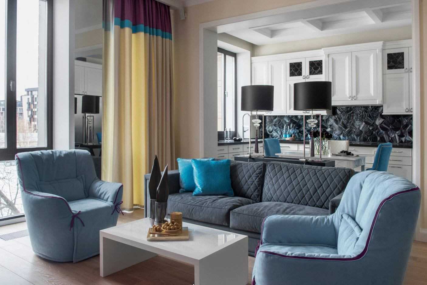 Современные интерьеры стремятся раздвинуть пространство. В совмещенной комнате-студии часто глазком в мир является один проем. В основном он размещается в гостиной. Шторы в таком помещении должны подходить под выбранный дизайн именно этой части квартиры, подчеркивать уют, не являться вычурным пятном на общем фоне.
