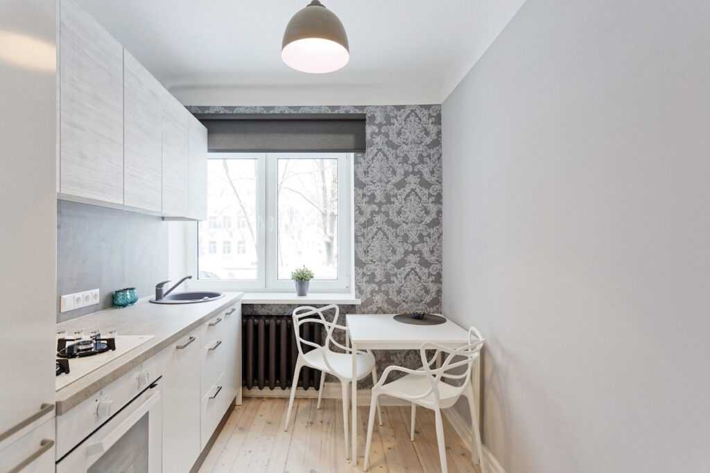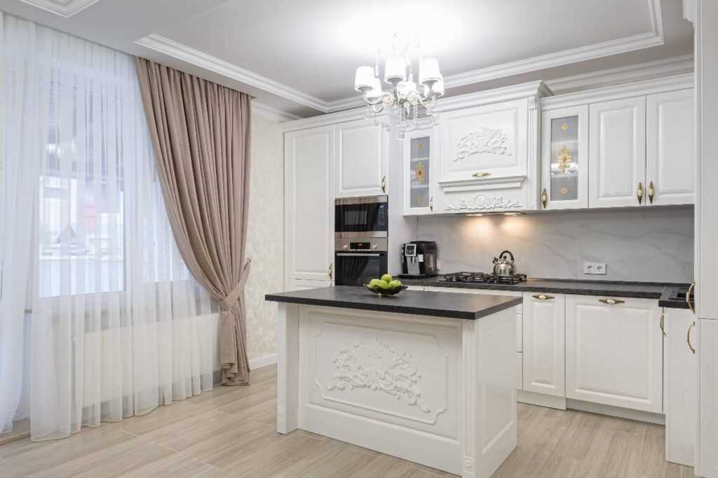 Белый цвет — классика стиля. В такой цветовой гамме могут быть выполнены стены, потолок, обеденный стол, фасад мебели. Использование одного цвета сделает помещение безжизненным. Чтобы этого не допустить, следует разбавить интерьер светло-голубыми, фисташковыми или серыми вкраплениями.