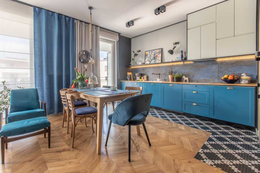 Насыщенный синий лучше применять дозировано, важно не переборщить. Доминирующим должен стать более светлый оттенок, в противном случае получится достаточно мрачно