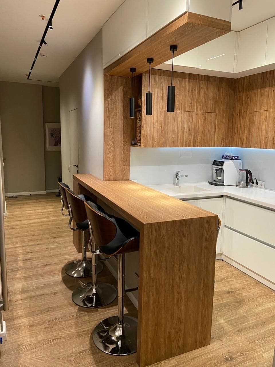 - С другой стороны барная стойка на кухне — идеальное место где можно перекусить или просто сделать небольшой перерыв. Обычно рядом с ней располагают барные стулья или высокие табуреты. Вы можете присесть за ней и поговорить с человеком, который готовит еду, или вместе выпить вкусный кофе.