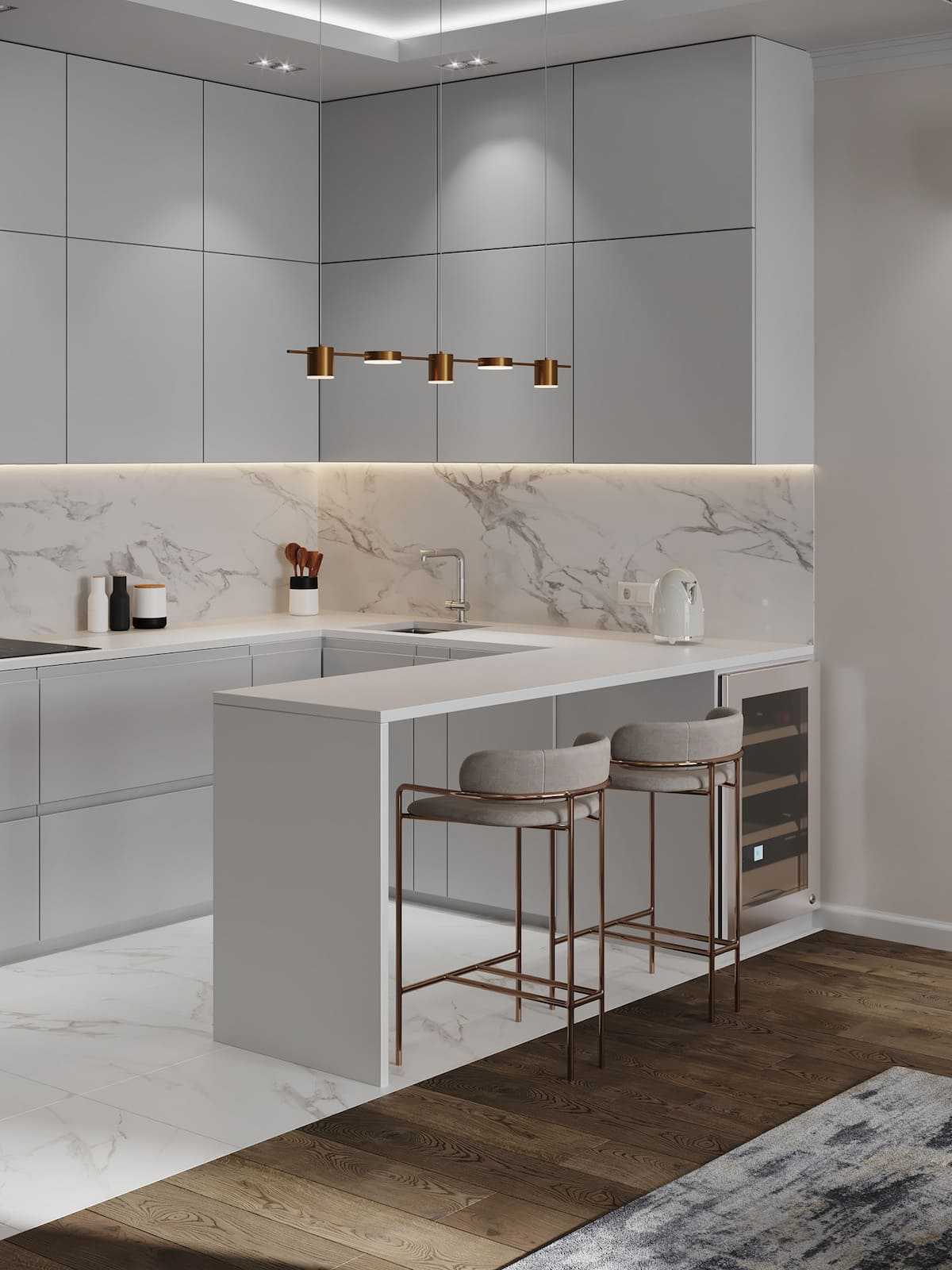 В этом случае барная стойка продлевает букву Г, делая ее чем-то средним между Г и П. Размещается она по соседству с одним из кухонных модулей – например, с холодильником или частью напольного гарнитура. В зависимости от местоположения и предназначения высота барной стойки может отличаться от других рабочих поверхностей. Под ней найдется место для бытовой техники, ящиков, открытых полок, стульев или … просто для удобного положения ног.